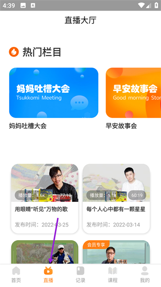 3、直播大廳含媽媽吐槽大會等熱門欄目,展示各類直播內容及播放量,豐富兒童閱讀相關的互動與內容場景。