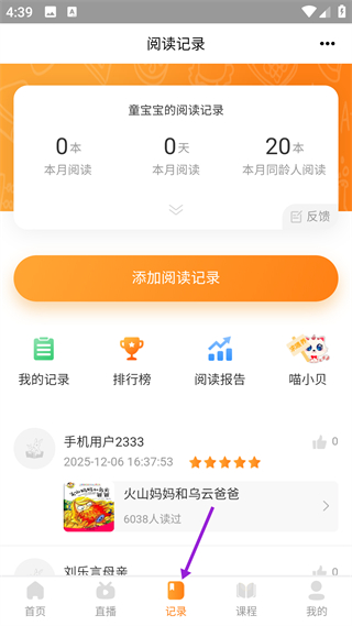 4、閱讀記錄界面展示本月閱讀數據,可添加記錄,含排行榜等功能,還能看他人分享,助力追蹤兒童閱讀情況。