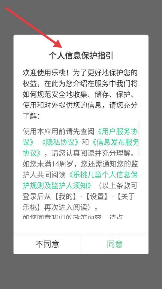 1、樂桃應用首先呈現個人信息保護指引,告知用戶信息處理規范,提示查閱多份協議保障用戶知情權。