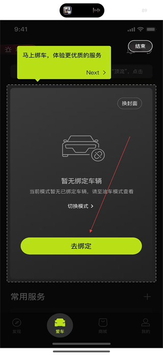 4、進入愛車頁面看到暫無綁定車輛的提示,點擊去綁定按鈕,進入車輛綁定的相關操作流程。