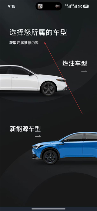 1、進入車型選擇頁面,根據自身車輛類型,選擇燃油車型或新能源車型,完成車型的選定操作。