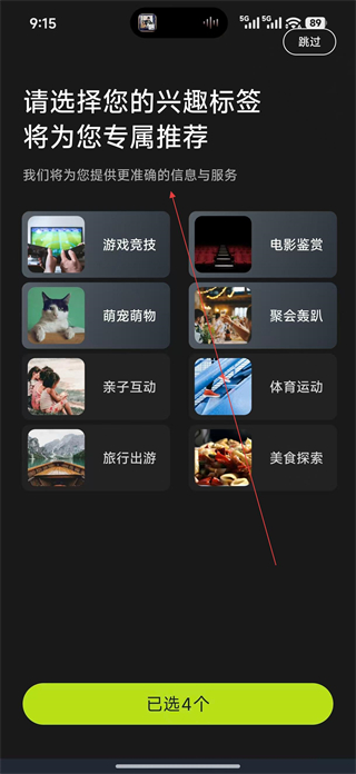 2、進入興趣標簽選擇頁面,挑選4個感興趣的標簽,比如游戲競技電影鑒賞等,點擊已選4個按鈕確認選擇。