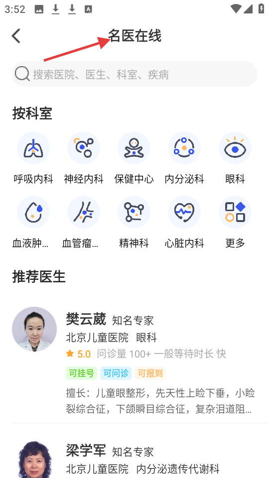 2、名醫在線頁按科室分類展示醫生,如眼科樊云葳等知名專家,顯示評分、問診量等可掛號問診報到。