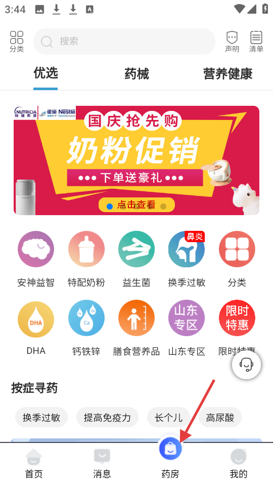 3、藥房界面含優選、營養健康等板塊,有奶粉促銷活動,按癥尋藥涵蓋多種癥狀助力家長為孩子找藥。