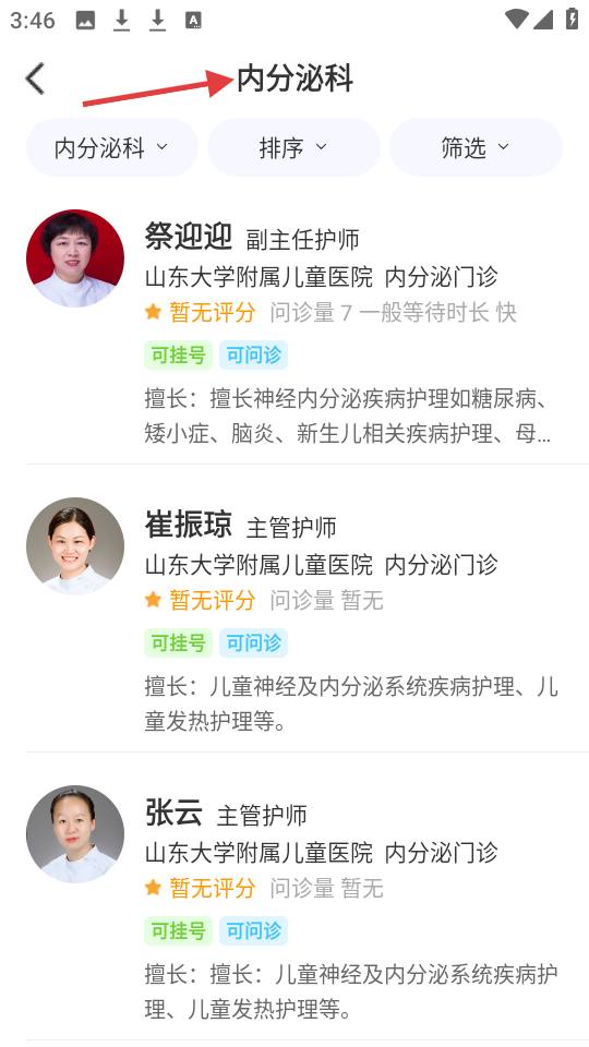 4、內分泌科醫生頁面,展示山東大學附屬兒童醫院醫護,如祭迎迎等,標明可掛號問診,介紹疾病護理擅長領域。