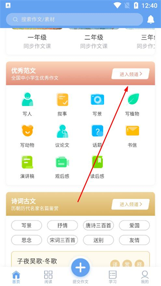 3、在首頁可點擊【五年級】、【初二】同步作文課,或通過【優秀范文】各分類學習寫作。