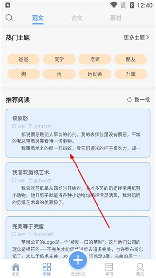 2、進入范文頁面選擇熱門主題分類,瀏覽推薦閱讀的作文內容,點擊感興趣的作文條目,進入該作文的詳情頁面查看具體內容。