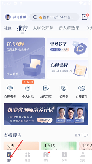1、進入心理學習平臺首頁,使用心理咨詢、AI練習室等功能,查看直播預告,是心理學習資源的綜合入口。