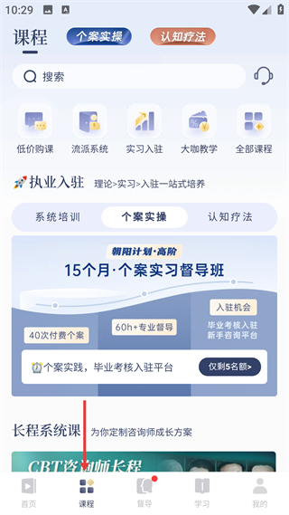 2、打開課程頁面,查看個案實操等課程分類,了解執業入駐相關培訓,選擇對應課程開展系統學習。