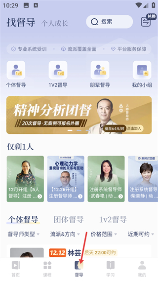 3、進入督導頁面,選擇個體、團體等督導類型,查看不同流派的督導小組,按需參與對應督導項目。