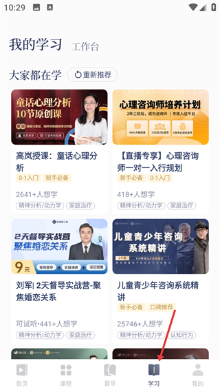 4、打開學習頁面,查看熱門課程,涵蓋童話心理分析等內容,選擇新手必備課程開展針對性學習。