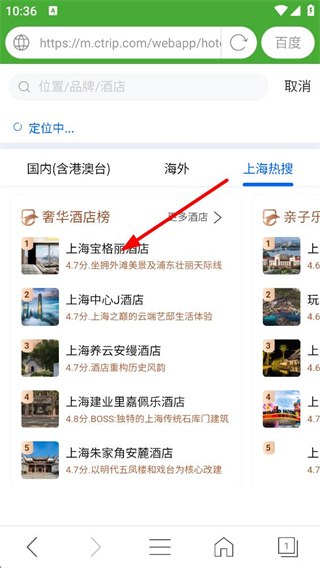 3、查詢后會顯示對應城市的酒店榜單,如上海的奢華酒店榜,可選擇其中的酒店如上海寶格麗酒店,查看其詳細信息及評分等內容。