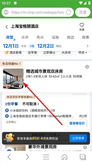 4、進入酒店詳情頁后,可查看房型信息如精選城市景觀雙床房,了解包含的權益及預訂規則,點擊對應按鈕即可進行預訂操作。