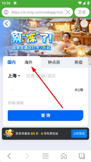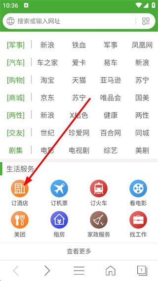 1、瀏覽器生活服務板塊,可看到訂酒店訂機票等功能入口,點擊訂酒店選項,即可進入酒店預訂界面,開始選擇所需的住宿服務。