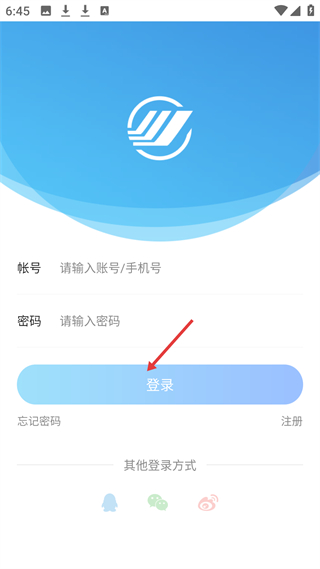 1、登錄界面,需輸入賬號密碼登錄,也可通過忘記密碼、注冊或QQ、微信、微博等其他方式操作。