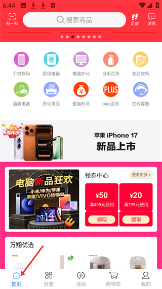 2、首頁有搜索欄,可瀏覽手機數碼等多商品分類,還有iPhone17新品上市、電腦新品狂歡、領券中心及萬翔優選商品展示。
