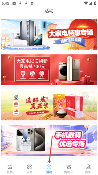 4、活動板塊,有大家電特惠專場、以舊換新、五常米推廣、手機數碼優選專場等活動,用戶可參與相應優惠活動。