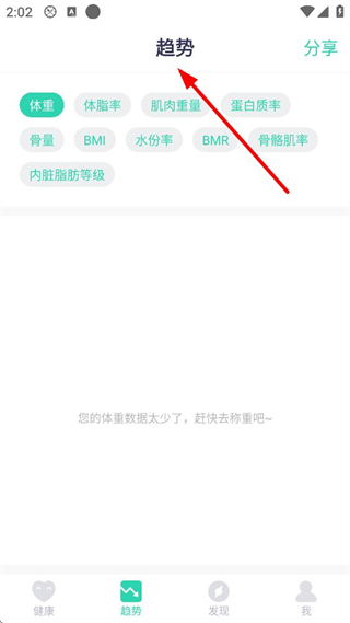 4、進入趨勢界面,可查看體重、體脂率、肌肉重量等多項身體數據趨勢,若數據較少可去稱重后查看,方便追蹤身體數據變化。