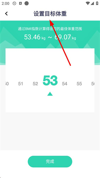 2、進入設置目標體重界面,可通過BMI指數計算最佳體重范圍,選擇目標體重后點擊完成,方便制定體重管理計劃。