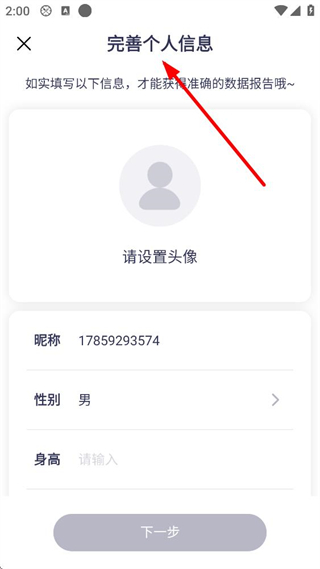 1、進入完善個人信息界面,需設置頭像,填寫昵稱、性別、身高,如實填寫可獲得準確數據報告,填寫完成后點擊下一步。