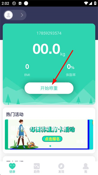 3、進入健康界面,可查看體重、BMI、體脂率等數據,點擊開始稱重可測量身體數據,還有熱門活動板塊,底部有健康、趨勢、發現、我導航選項。