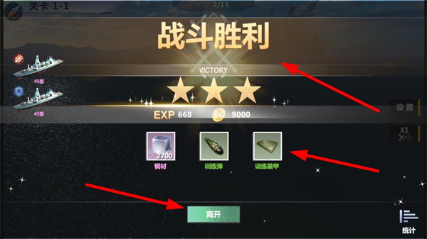 4、戰斗勝利后可獲得經驗、資源等獎勵,點擊離開結算界面,繼續挑戰新關卡或養成艦船,提升艦隊實力。