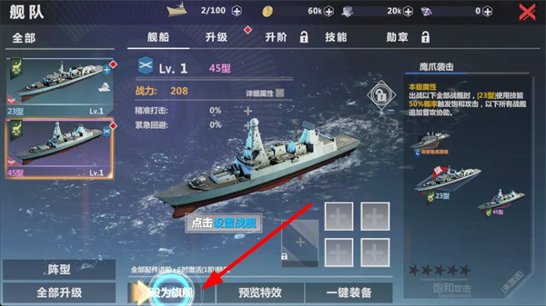 2、可以在艦隊界面升級艦船,提升艦船屬性和戰力,點擊設為旗艦,強化艦隊核心戰力,優化艦隊配置。