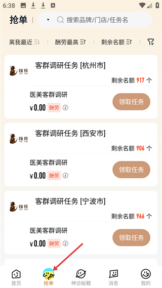 2、探搶單頁,展示杭州、西安、寧波等地醫美客群調研任務,可按離我最近、酬勞最高、剩余名額篩選,領取任務。