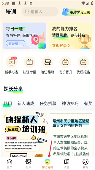 3、神訪秘籍頁,有每日一題、能力排名等培訓板塊,還有探長分享的新人培訓班、任務招募等內容,助力用戶成長。