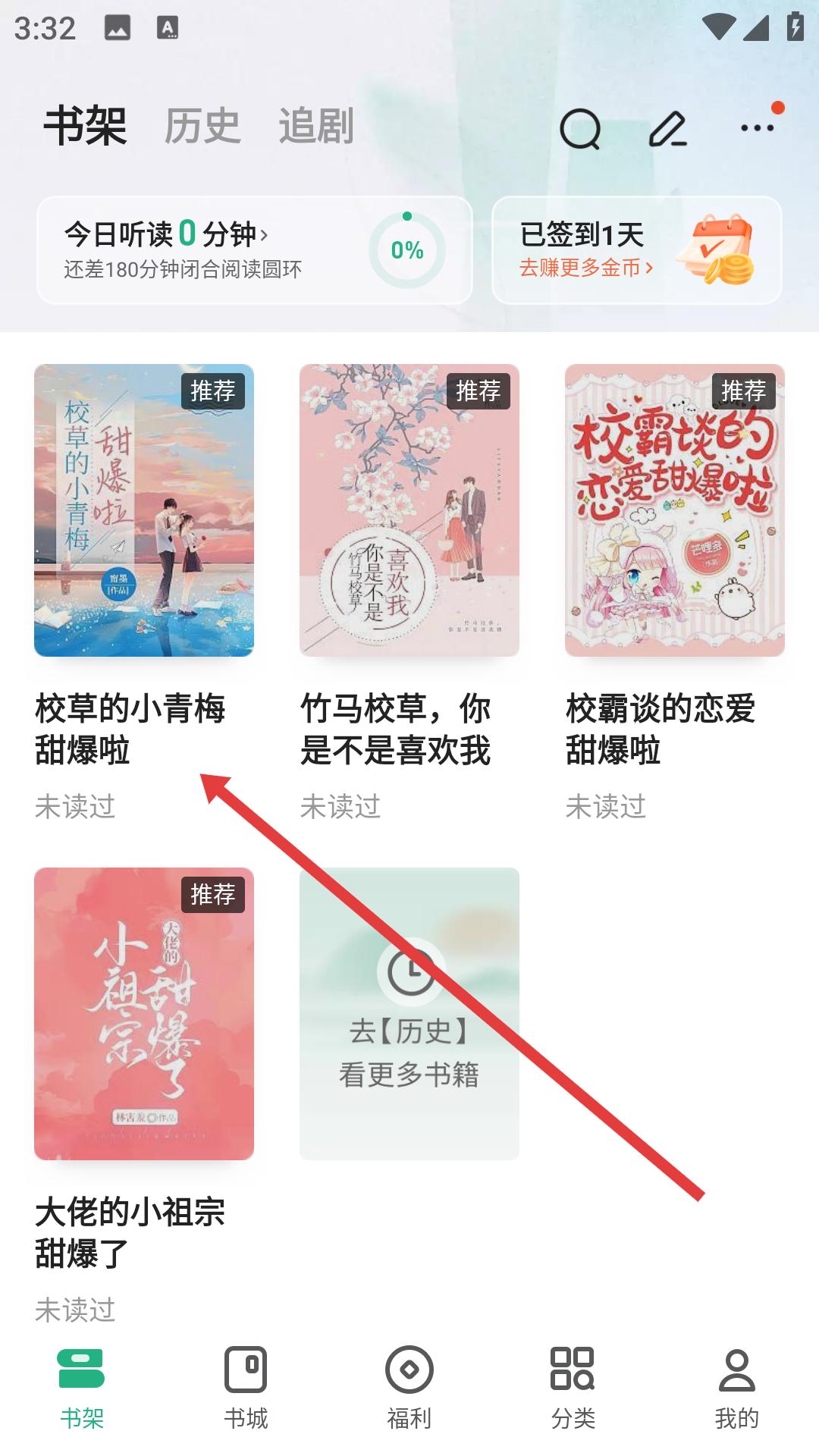 1、進入書架頁面,瀏覽書架上的書籍,找到校草的小青梅甜爆啦這本書,點擊進入該書的詳情頁面。