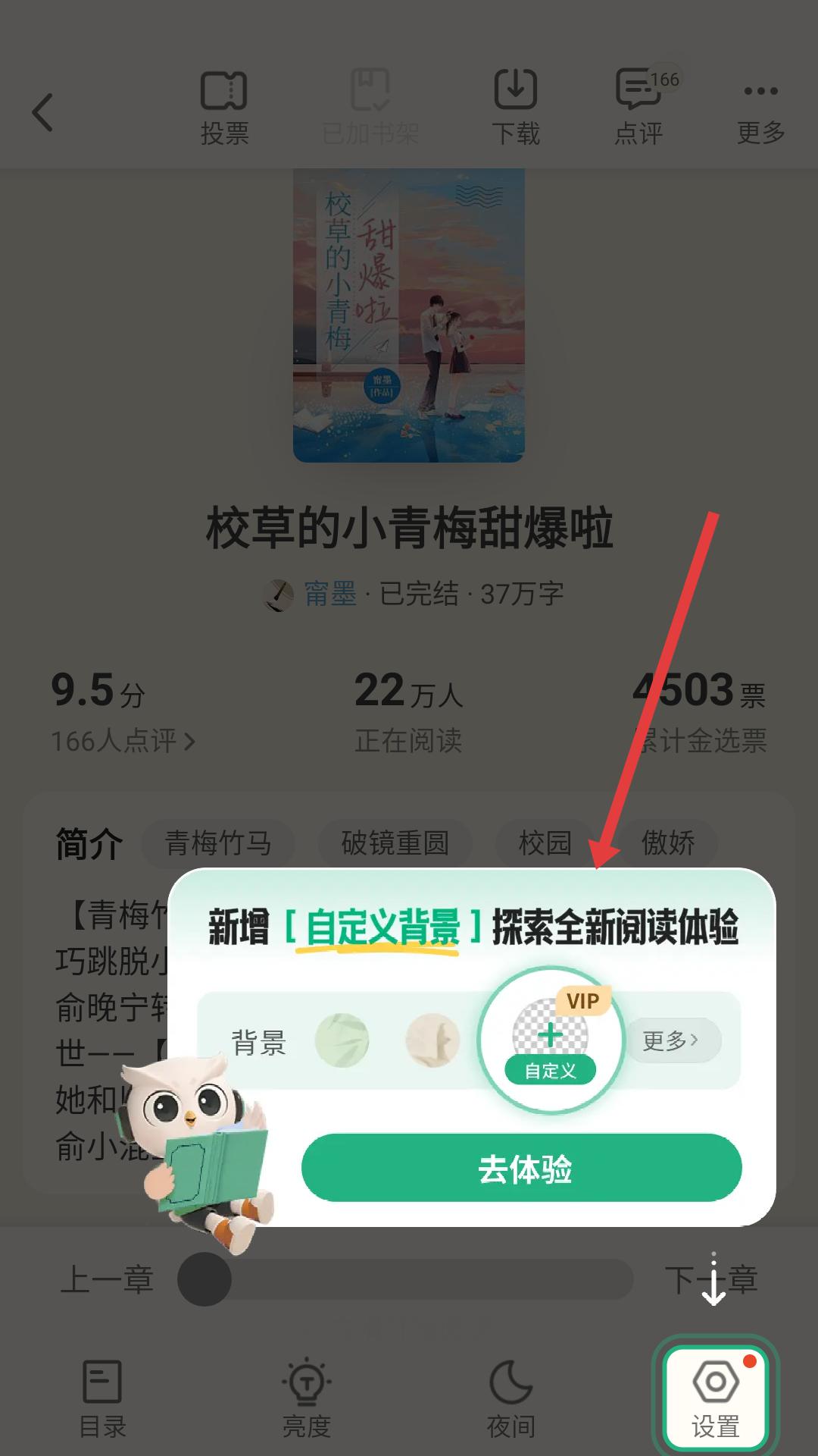 2、在校草的小青梅甜爆啦詳情頁面,看到新增自定義背景的提示彈窗,可根據需求選擇是否點擊去體驗,隨后進入書籍閱讀界面。