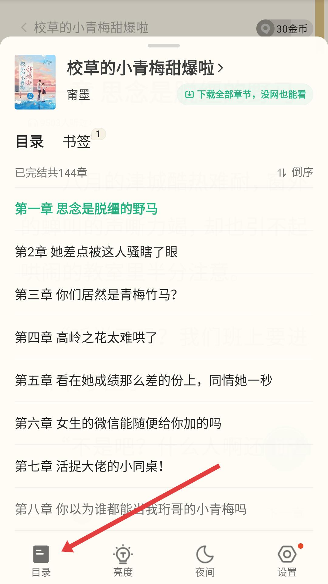 4、在閱讀過程中若想查看書籍目錄,點擊頁面下方的目錄按鈕,展開目錄列表,可選擇想要閱讀的章節,繼續閱讀書籍內容。