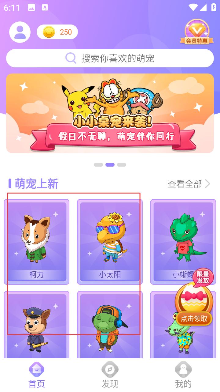 1、開小小桌寵首頁,找到萌寵上新板塊,瀏覽柯力小太陽等寵物,點擊喜歡的卡片,進入詳情頁按指引領取或兌換。
