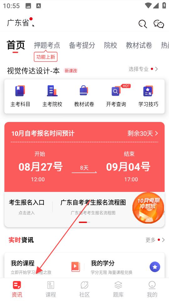 1、資訊界面,有押題考點、備考提分等多個功能分類,還有10月自考報名時間預計等信息和考生報名入口等功能。