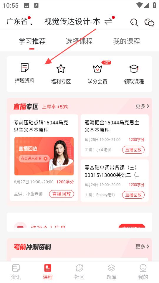 2、課程界面,有學習推薦、選擇課程等功能分類,還有押題資料、福利專區等功能入口,展示了直播專區和考前沖刺資料等內容。