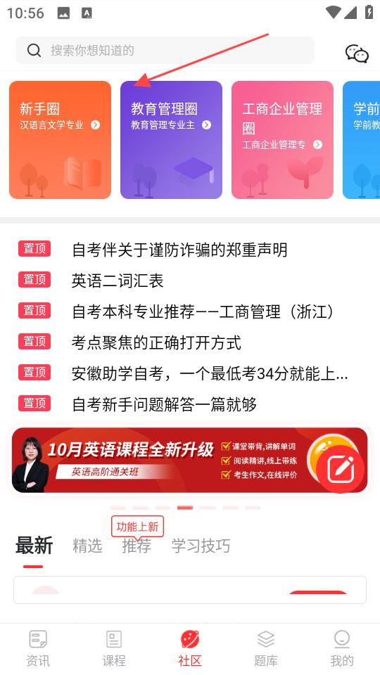 3、社區界面,有新手圈、教育管理圈等多個社區分類,還有自考伴關于謹防的鄭重聲明等置頂帖子。