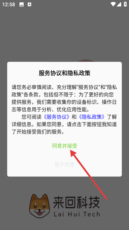 1、打開APP首先彈出服務協議和隱私政策彈窗,了解收集設備標識、操作日志等信息用于優化服務的規則,確認無異議后點擊同意并接受,這是使用APP各項服務的基礎前提。
