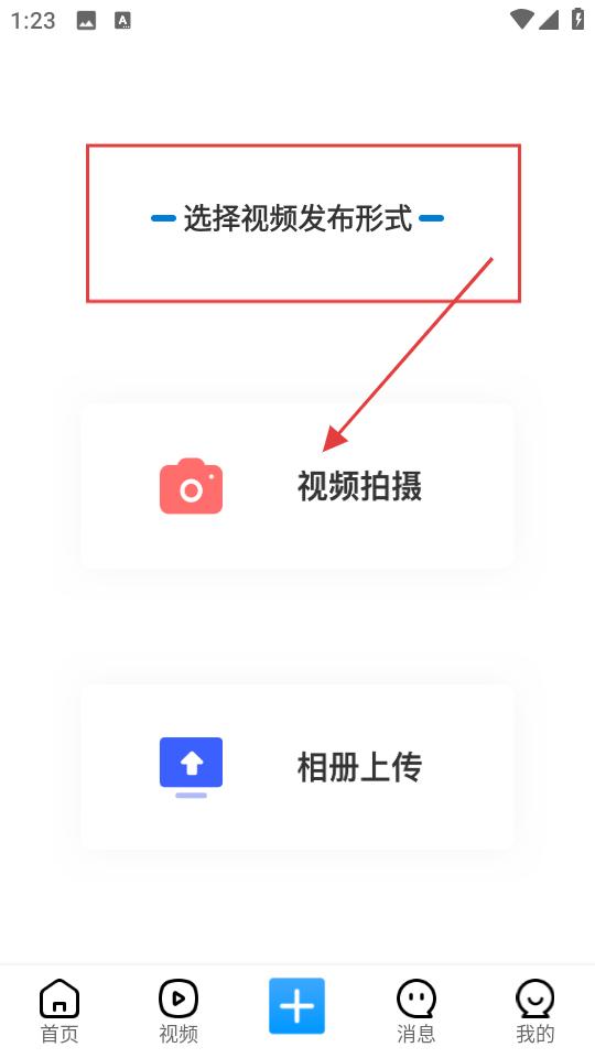 2、進入選擇視頻發布界面,依據自身需求選擇視頻拍攝選項,直接開啟相機錄制建筑現場相關內容,或選擇相冊上傳選項,從本地相冊中選取已保存的視頻文件。