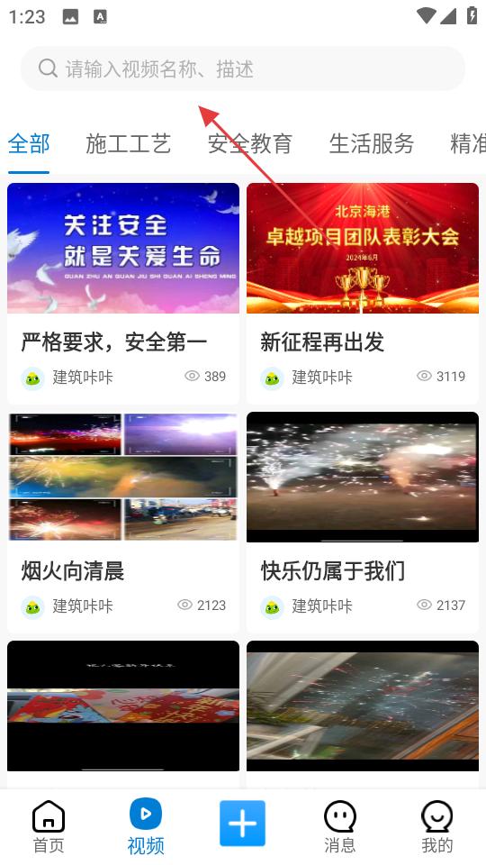 3、在頂部搜索欄中輸入視頻名稱和詳細描述,從下方標簽庫中挑選合適的分類標簽如施工工藝材料驗收等,確認所有信息無誤后點擊提交完成發布。