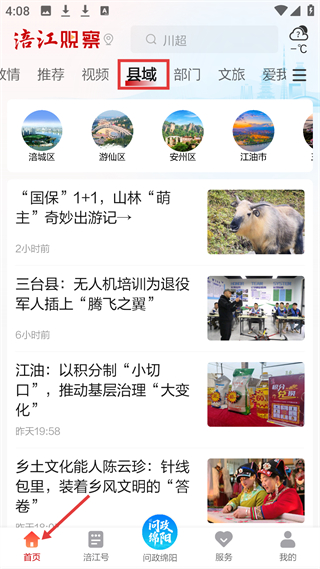 1、首頁縣域板塊,聚焦涪城、游仙等區域資訊,有自然、人文、社會發展新聞,展現綿陽縣域多樣風貌。