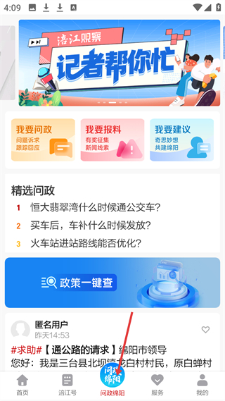 3、問政綿陽板塊,設我要問政、報料、建議通道,有精選問政內容,市民可反饋訴求、參與城市建設。
