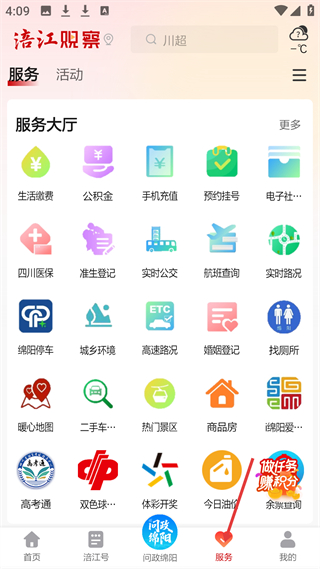 4、服務板塊,有生活繳費、公積金等眾多便民服務,還有綿陽停車、高考通等本地特色服務,滿足市民多方面需求。