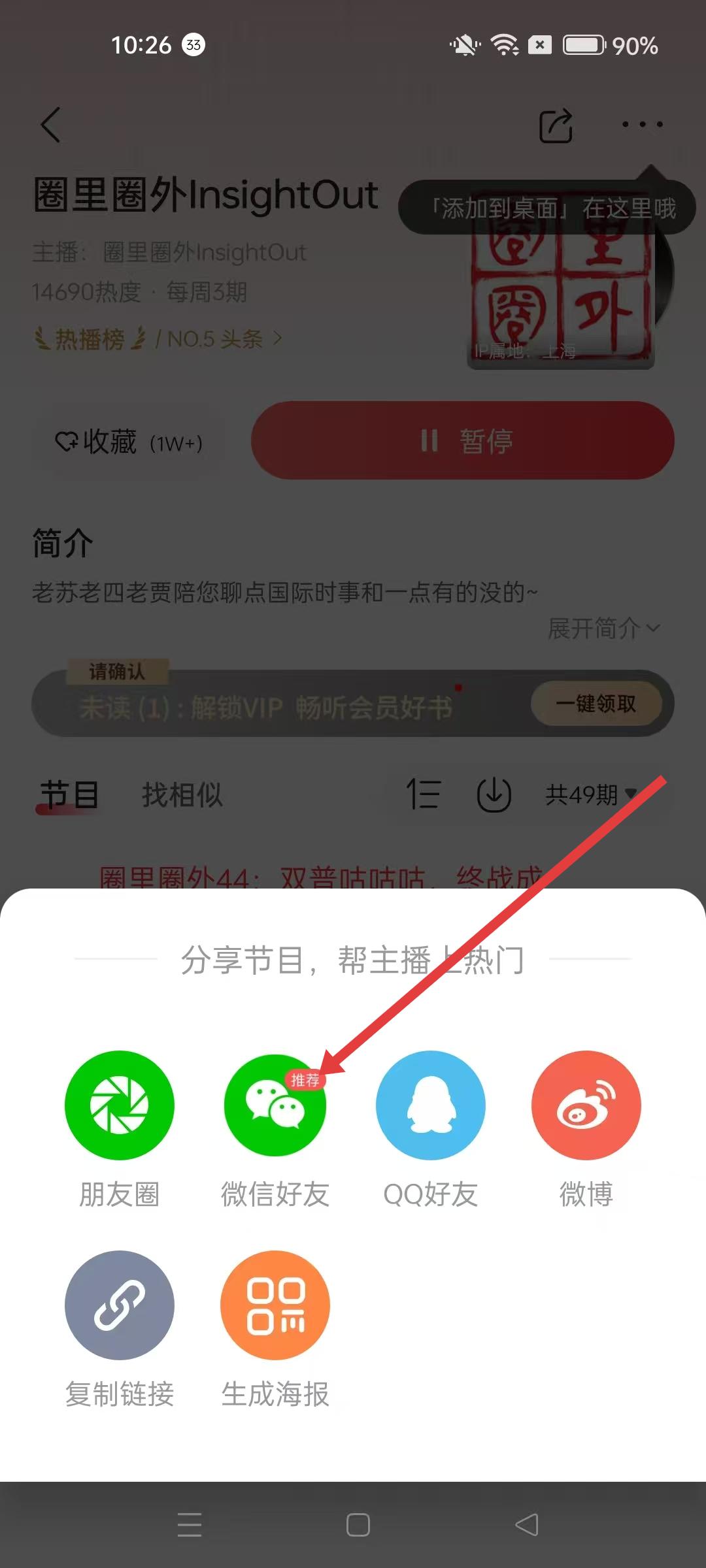 3、節目播放頁面點擊右上角分享按鈕,展開分享選項,可選擇朋友圈、微信好友、QQ好友、微博等渠道分享節目。