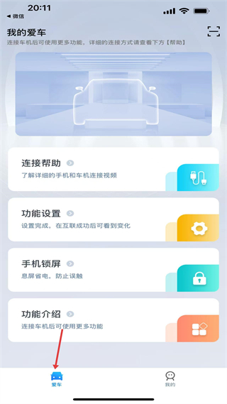 1、愛車,提供連接幫助、功能設置等入口,說明車機連接后解鎖更多功能,是互聯操作的核心起點。