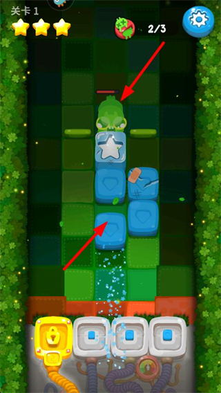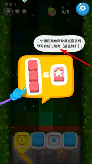 2、了解合成規則,三個相同顏色的磚塊垂直擺放后,就能合成為星星磚石,按照這個規則來規劃磚塊的投放位置。