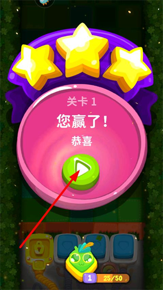 4、關卡完成后會出現您贏了的提示界面,顯示三顆星星,點擊綠色按鈕即可進入下一關,繼續新的合成挑戰。