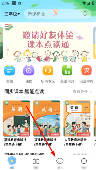 1、進入課本點讀通首頁,可看到同步課本智能點讀等板塊,點擊底部聽書按鈕,進入聽書頁面,該頁面包含推薦分類及各類聽書內容板塊。