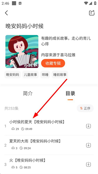 3、進入晚安媽媽小時候的音頻詳情頁,可查看內容簡介與集數目錄列表,選擇對應的集數條目,即可啟動該集音頻的播放流程。