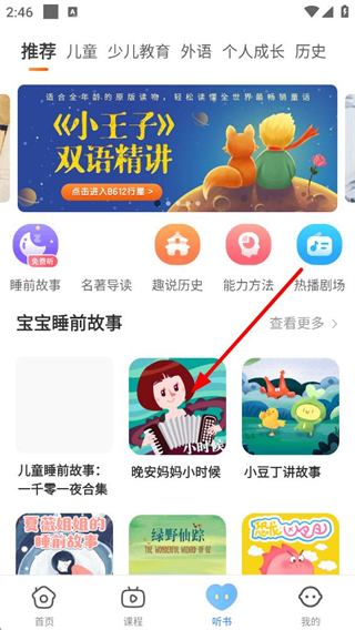 2、聽書頁面,能看到兒童少兒教育等分類,還有寶寶睡前故事板塊,選擇晚安媽媽小時候這一音頻,進入該內容的詳情頁面。