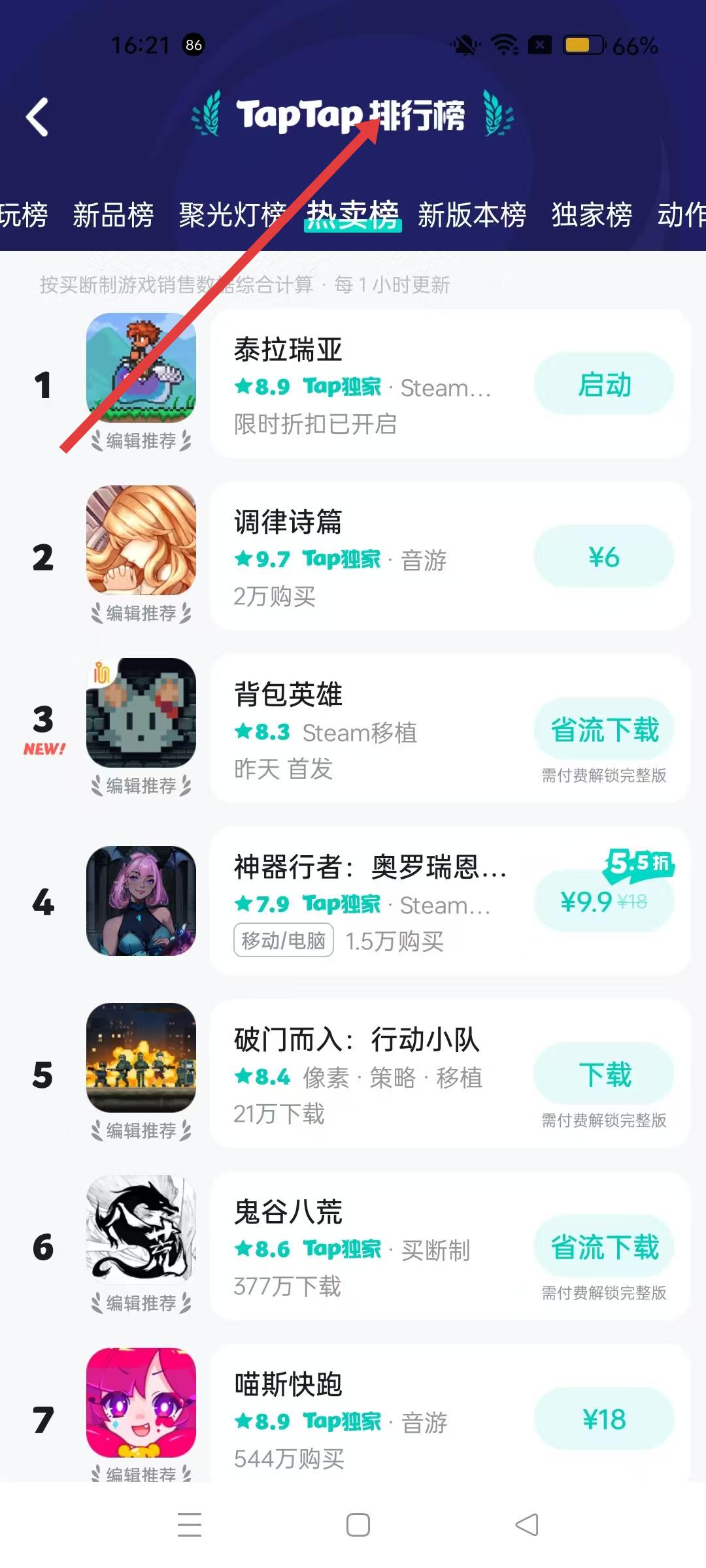 4、進入排行榜界面,可查看熱賣榜等各類榜單,如泰拉瑞亞、調律詩篇等游戲的排名及銷售情況,了解游戲熱度。